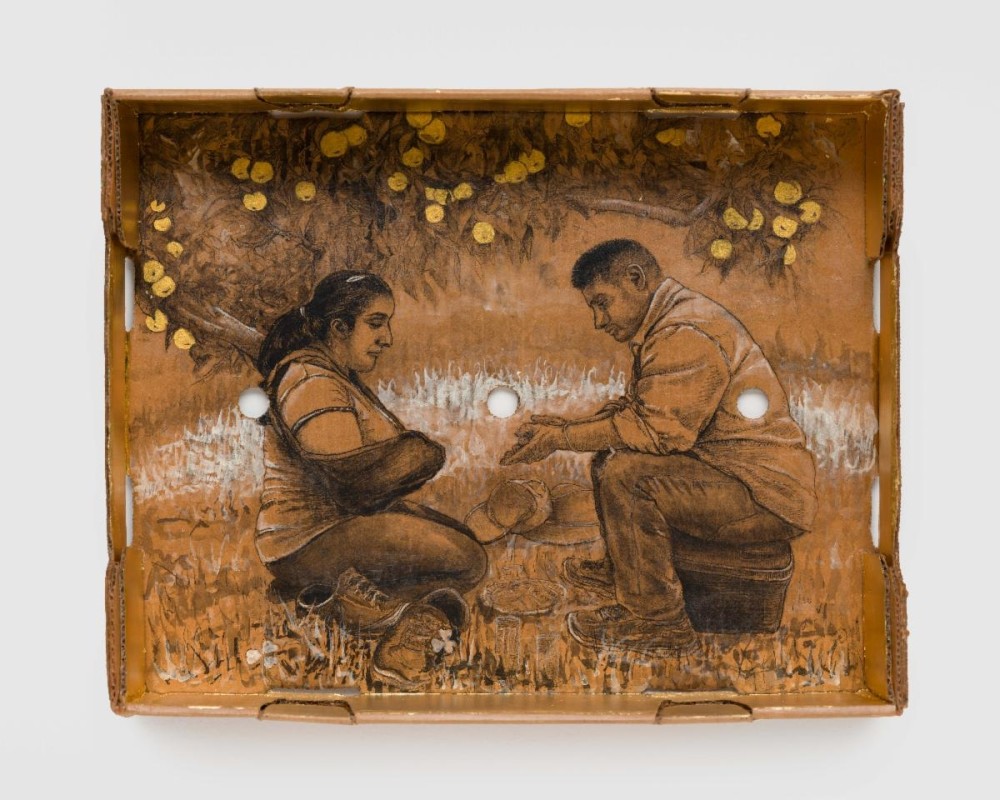 Charlie James Gallery is proud to present new works by Narsiso Martinez in Joyfully Grown, the artist’s third solo exhibition with the gallery. Working in charcoal and mixed media on found cardboard produce boxes, Martinez draws from personal experience and relationships to highlight the lives and dreams of farmworkers. Martinez’s works make visible the individuals who go unseen in the American agricultural system, upon whose painstakingly physical labor the entire system relies. These works draw upon visual languages of power, especially Catholic portraiture, to uplift workers and remind the viewer that the work for representation and equality is ongoing.