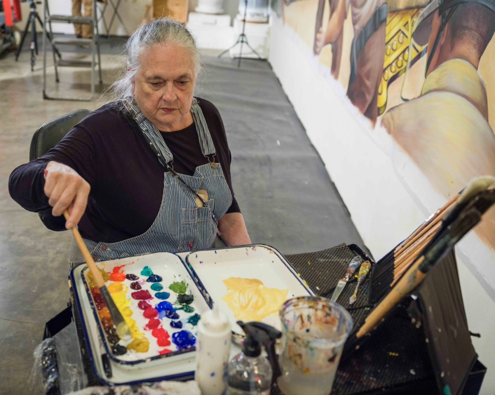 SPARC’s expansion of The Great Wall of Los Angeles is currently in production under the artistic direction of Judith F. Baca. Consisting of a team of three lead artists, four painting assistants, and visiting professional muralists, SPARC’s innovative artistic technology has blazed a pathway for year-round mural production. Painting on 12-foot high poly-synthetic panels that are upheld by a railing and scrolling system, SPARC’s Great Wall of Los Angeles is able to partner and travel to various studios, galleries, and community-centered locations with generous support from the Mellon Foundation, California Natural Resources Agency, California Community Foundation, and Adams-