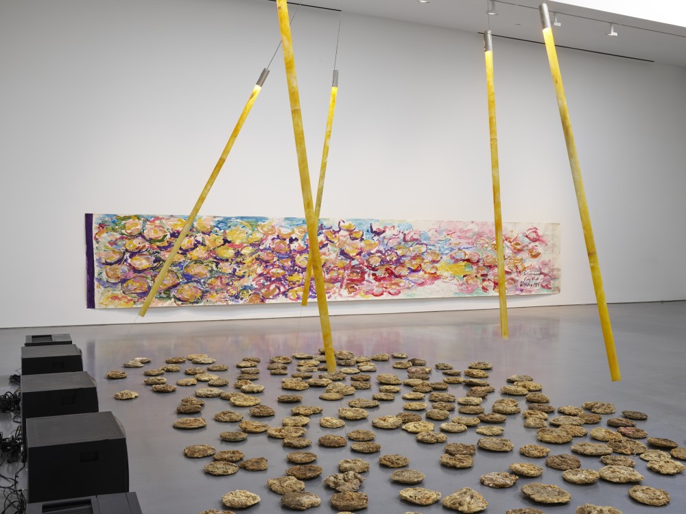 Alongside this installation, the exhibition includes a series of drawings that Schneemann simultaneously created to document the imagery and possible configurations of Video Rocks—expressive sketches in paint, crayon, and marker that capture the artist’s sources and methods. A selection of these works, including a 31 ½-foot-wide painting of pink and yellow floral forms that hangs horizontally on the adjacent wall—a reference to the water lilies in Schneemann’s dream—is also on display. Framing the entire assemblage in the gallery are five acrylic light rods suspended from the ceiling, illuminating the rocks below and adding another layer of lyricism to this ‘dream/vision’ space, as the artist described it.