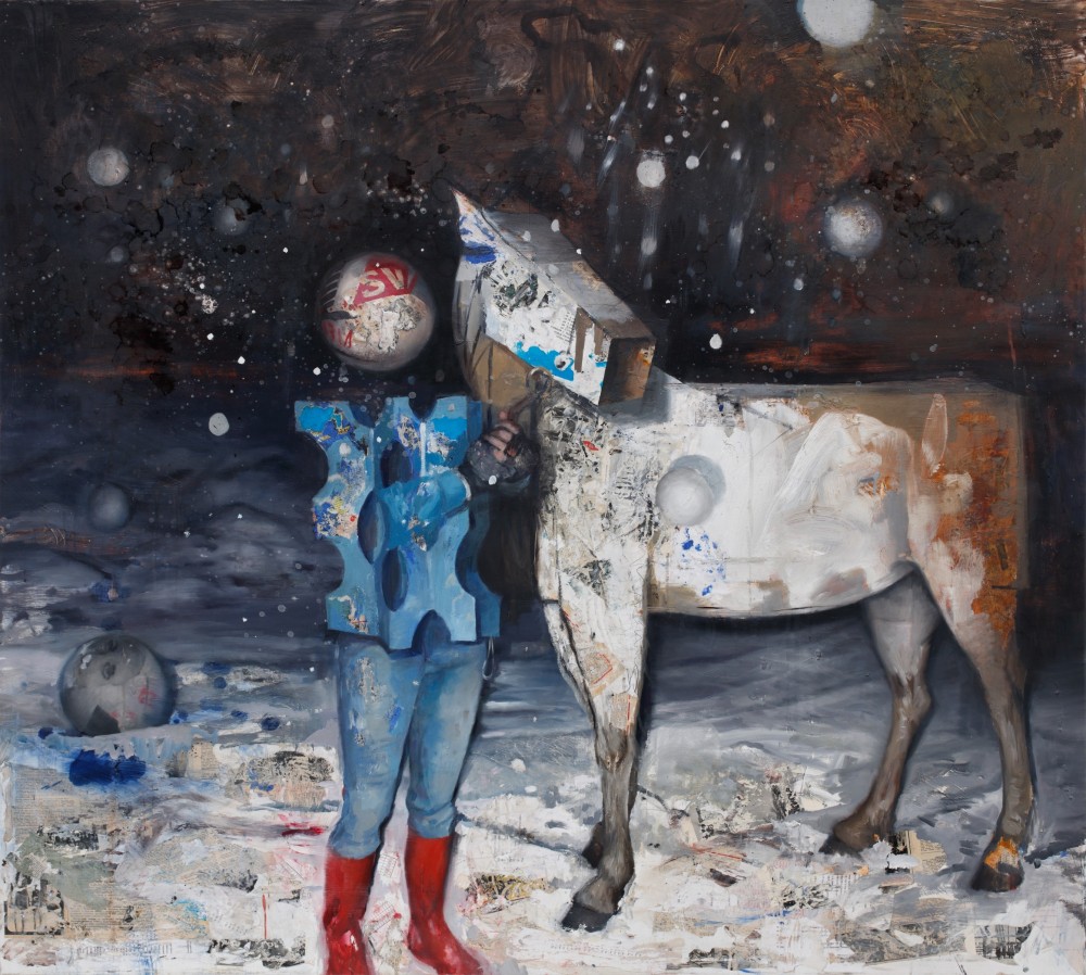 In terms of painting technique, the works are very dense and multi-layered, offering an experience both of the image itself and of the rich layers of textures, which the artist achieves through gradual layering of materials, such as glued paper or ash, with acrylic underpainting and oil paint for the final layers.