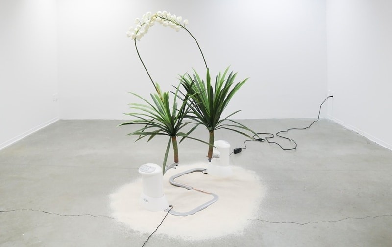 Perfect Lovers (2023) serves as a centerpiece for the show. The work features two motors from baby rockers, connected on the floor by an s-shaped metal bar that’s submerged in a bed of white sand. The motors bump up and down, squeaking softly as each waves a metal arm back and forth. These limbs hold two artificial plants, which hover above the ground in an apparent dance. Sometimes the plants sync up. Sometimes they drift apart.