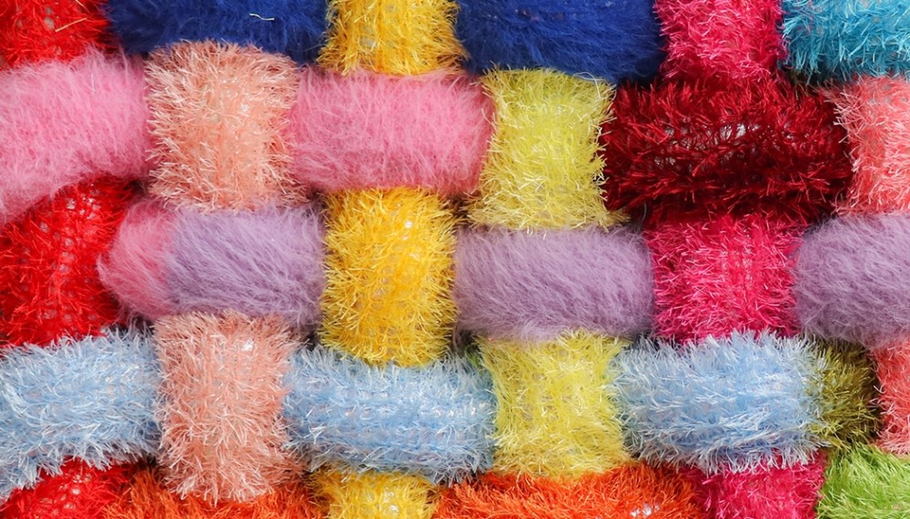 Anchoring one wall of the exhibition is a series of four woven panels, robust in texture and presence. Made from vibrantly colored eyelash yarn, creating visual fluff. Sanchez invites both overstimulation and meditation.