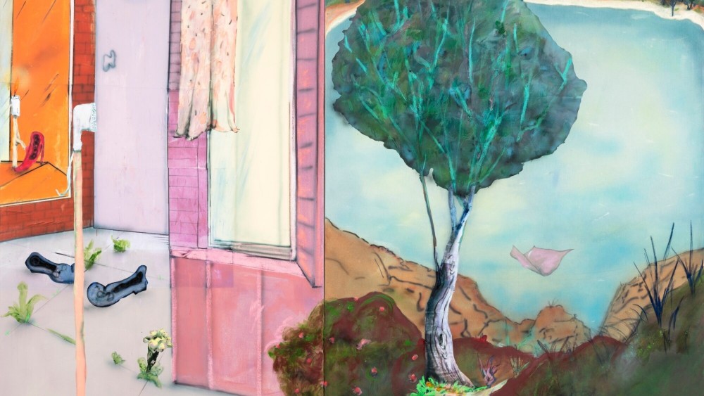 A recurring cast of props, plants, and personal effects unite these environments. Emblematic trees reappear at different scales; circular moons rhyme with faucet handles, basins, and glass rims; abandoned shoes mark the stage like floors. Treiber uses these motifs as pictorial devices, as anchoring points around his varied paint languages. Airbrushed haze, scumbled passages, cartoon-outline notations, and paste-ups share the same field. Treiber indulges the pleasure of atmosphere and color while skirting the seamlessness of illusion.