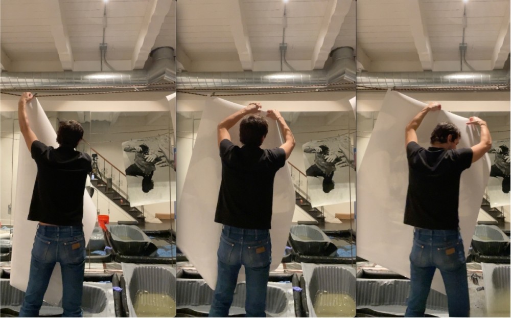 Concurrently, Tomka presents a new series of photographic prints for Made in L.A. at the Hammer museum, entitled Motion Pictures. To create this work, the artist blacked out the windows of his bachelor suite in the Gaylord building, turning the living area into a room-size photo enlarger. Repurposing the apartment’s modest furnishings, he tilted his mattress to a vertical position and embedded a projector within its springy structure. From video footage of friends and local surroundings, he caught subtle movements on light-sensitive silver gelatin paper. The wet procedure of developing in the bathroom invited in a level of messiness and chance, allowing for unexpected chemistry to influence the unique prints.