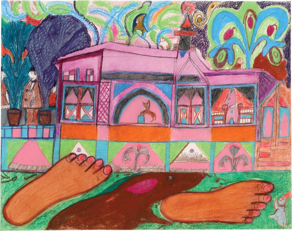 During the last fifteen years of her life, artist Nellie Mae Rowe (1900–1982) lived on Paces Ferry Road, a major thoroughfare in Vinings, Georgia, and welcomed visitors to her “Playhouse,” which she decorated with found-object installations, handmade dolls, chewing-gum sculptures, and hundreds of drawings.