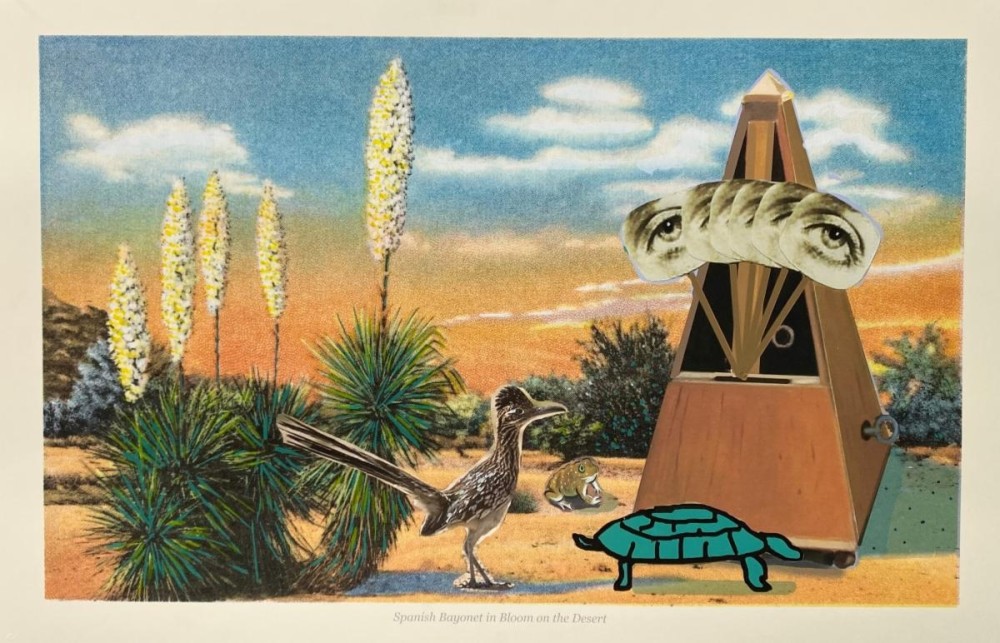 For these prints, Guerrero has elaborated on the idea of the postcard, referencing pre-colombian artifacts alongside allusions to Brancusi, Man Ray, and Magritte. Guerrero has made work informed by his experiences navigating cultures as an American of Mexican ancestry in Southern California. His work depicts—and critiques—colonial narratives in the Americas such as the settlement of the Great Plains, the history of Latin America, and imposed notions of the American “West.” With compositions fusing Mexican, American, and European visual traditions, he incorporates influences ranging from the readymades of Marcel Duchamp to conceptually-oriented practices associated with a preceding generation of California artists (including John Baldessari and Ed Ruscha) who emerged from Guerrero’s alma mater, the Chouinard Art Institute.
