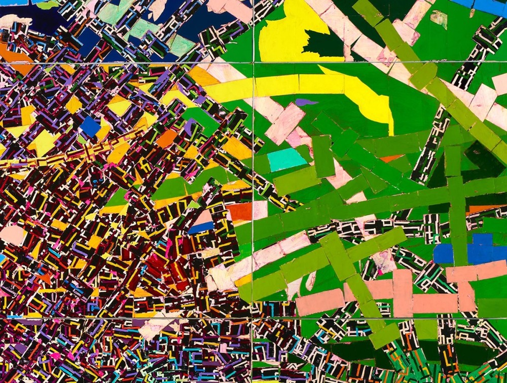 Spanning twenty-eight feet in length, Rick Lowe’s collage painting Cavafy Remains (2024) is dedicated to Greek poet C. P. Cavafy. The large-scale work is structured by intersections and nodes that evoke lettering, maps of urban infrastructure, and the forms of domino games in a layered weave of vivid colors and intersecting lines.