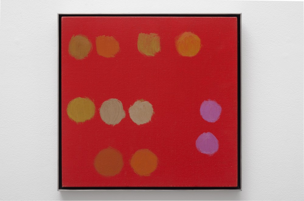 The works on view grew organically from the concerns of Ohlson’s celebrated late-60s Panel paintings, monumental arrays of thin vertical canvases which examined tension, harmony, and their resolution through perfectly refined placement of colored square forms. As he continued to create studies for the series, the squares gradually morphed into loose circles and their geometric arrangements became less rigidly defined. The complex relationships among the colors captured Ohlson’s attention as he began to experiment with aerosol, which allowed for purer and denser applications of the paint spots and an alchemical interaction between the fuzzy outer halos and their background hues. As the artist continued to experiment with this modality, his forms began to overlap and abut one another, creating overall cohesive color fields with complex internal movement.