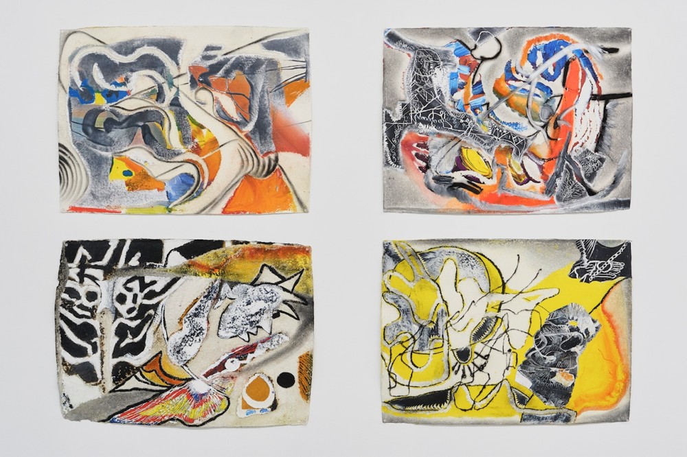 An economical palette of predominately primary colors interplay with blacks, whites, and greys on thick 1000gsm handmade papers. Lanyon explains: “ultimately I want these works to have the look of collage without ever being cut or pasted. I use paintbrushes sparingly but prefer a lot of disposable gloves for finger painting. So, these paperworks are a combination of drawing and painting - drawing with paint.” A continual process of building up layers, sanding back, and revising is made possible due to the material depth of the paper. Initially, the paper’s hard, rough texture allows the paint to sit on the surface, however, after sanding, it is fluffy and absorbent. Formal shapes, patterns, and symbols emerge in the works informed by art historical narratives as well as personal and playful reference points. Ultimately, the process of exploration trumps a particular ideology or perspective.