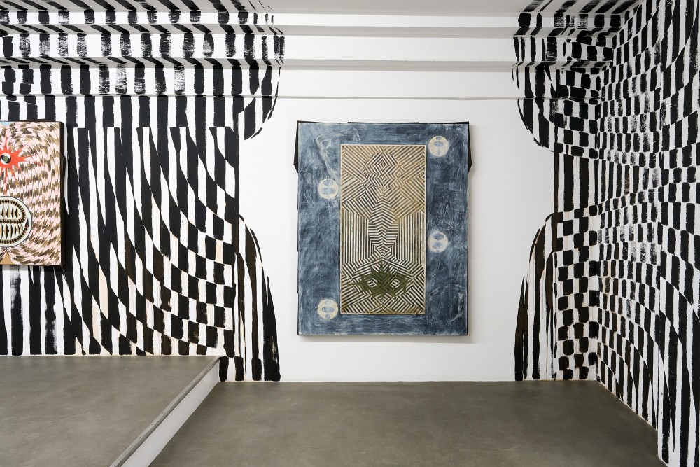 Symbolism plays an imperative role in these works. The snake is a protector of secrets and part of the consciousness that warns of the overwhelming power of the unconscious, fish imply nutrition both physically and spiritually, fire is a source of life and destruction, and a starburst is a release of condensed energy and indicator of new beginnings—these are a few of the readily visible images that appear. In the lower level of the gallery, the red glow of the ocher in the works is a reference to the Lammergeier vulture, alluding to the interconnectedness of life and death with its practice of covering itself in iron ocher and feeding off the bones of other animals. Picken utilizes the gallery’s layout to envision another level of symbolism. The gallery's upper level, painted throughout with undulating geometric patterns, suggests that one is entering a dream space within a dream. A reminder that the physical world is both incomprehensible yet unavoidable. A molecule of water is hardly observable, but an ocean is too large to see in its entirety. Between those extremes where matter appears solid and God becomes an icon, we can grasp meaning.