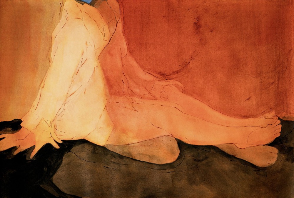 The exhibition unfolds through a nuanced chromatic arc, beginning with the sharp acidity of orange and gradually descending into the dense quietude of viridian green, with ochre recurring as a grounding emotional register. The horizontal orientation of the works on paper lend a cinematic rhythm, evoking suspended moments and fragmentary recollections. These paintings possess a raw immediacy that is both gestural and deliberate, hovering between meditation and unfinished narrative. Michell distills vulnerability and movement through fragmentation: a foot curled inward, an elbow extending outward, a pelvis hinted at more by its absence than its contour. The central canvas amplifies this language, presenting a reclining figure stretched across a couch-like form—part domestic furniture, part psychoanalytic symbol. The posture is uneasy yet intimate, a site of both exposure and quiet introspection.