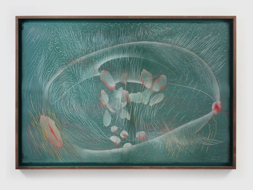 In Potential 2, 2020, and Potential V, 2020, Voigt hand dyes paper with hues that corresponded to specific stimuli or emotions—a midnight blue that has may allude to marine or cosmological phenomena —then adds her meticulous notations, gold leaf, and gestural markings to convey a dream state, at once familiar and otherworldly. In Trust and Rain in June I, 2020-21, Voigt uses gold leaf, pastel, oil chalk, and India ink to examine weather systems, creating imagery at once microscopic, marine, and saturated. Her complex techniques mirror the artist’s multifaceted thinking: successive layers of ink, pastel, colored pencil, and intricately inlaid precious metal leaf.