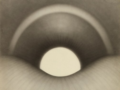 From these abstractions, Abularach’s compositions evolved towards more recognizable ocular imagery.  In Túnel - Entrada, 1970, for example, a luminous white circular orb rises like the sun over a landscape, the entire image evoking a large human eye.  Even more realistic are Abularach’s meticulous ink drawings (Sirena, 1983) with their exquisite cross hatching in razor fine ink pen
