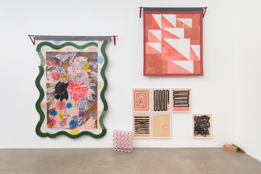 The sculptures, paintings, and drawings in this presentation offer a glimpse of a larger body of work over fifteen years in the making. While the form of an exhibition demands abridgement, the full sweep of this project remains a reverberating presence. Each piece in Where there is great love . . . is the result of a chain of responsive interventions: Shull may extend, distill, or recontextualize an element in response to its associative potential. Extrapolating the form of a gun from a particular configuration of blocky, shaped canvases in an early iteration of Flesh Field (2003), the artist made this association explicit by inscribing a pistol grip directly on the wall with Sharpie. The drawing Road Romeo (2003) is an inventive homage to the name of a bus that Shull spotted while working on an off-off-Bollywood production in Guyana. Struck by the schmaltzy designation, the artist concocted his own vision of romance in motion: a headboard (a decor flourish rattling with naughty subtext) on wheels, their rotation and velocity conveyed by Shull through spectral doubling and brisk, dizzying motion trails. Evocations run amok: the straightforwardly titled Inflatable Bedsheet (2012) is at turns swollen with hot air and abjectly flaccid, like some giant wad of bubble gum engorged and then collapsed, sans the decisive, sexy snap; made of vellum, a substrate derived from animal skins, the blush-colored folds of Paper Vaginas (2002) have devastatingly Freudian origins (an attempted Mother’s Day card).
