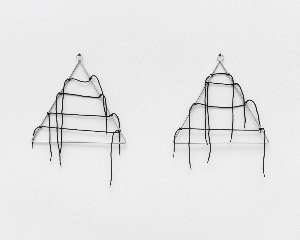 Surrounding the films, Kiiski’s sculptures are made from found, used, and inherited materials—ceramic dolphins, home decor, shoelaces, and wilted painted flowers—objects pre-charged with the residue of personal histories, consumer cycles, and cultural kitsch. Rather than purify or explain, Kiiski allows these materials to remain in their in-betweenness: awkward, sentimental, and animate. The works explore an aesthetic that sits at the crossroads of crumbling modern civilization and its detritus. Kiiski’s readymades become emblematic: Maslow's triangle, the mug as a vessel of comfort, the dolphin as a symbol of intelligence, play, and captivity. On the back wall are two photographic assemblages, presented in ultramarine blue frames. Created with a printed passe-partout, each contains four images arranged like holiday snapshots, hung on the wall like a family heirloom.