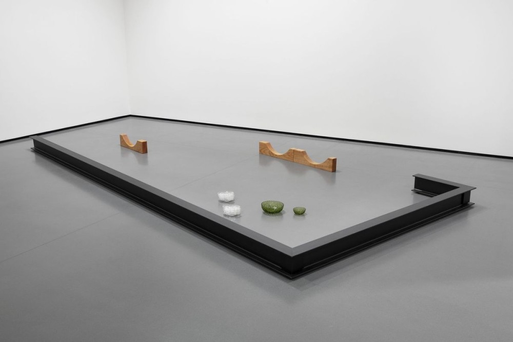 This possibility of new meanings underlies the title of Hewitt’s exhibition, New Waves. For her presentation at Perrotin Los Angeles, Hewitt presents her still life photographs alongside two additional works: a floor sculpture, Untitled (Imperceptible, Slow Drag, Barely Moving), 2022, and a work made in collaboration with Jamal Cyrus that nods to the Fluxus legacy of Benjamin Patterson, a sculpture whose title functions as an event score: For Solo Hammond B3 Organ, Double Contrabass Flute, or Tambourine (This Score May Be Realized in Any Imaginative Way, or in conjunction with or in response to the recording of the song Rock Steady 00:03:15 on the album Young Gifted and Black, Atlantic Records (1972) with Aretha Franklin on lead vocals and piano, Donny Hathaway on electric piano and organ, Bernard Purdie on drums, Cornell Dupree on guitar, Richard Tee on organ, Chuck Rainey on bass guitar, The Sweethearts of Soul (Brenda Bryand, Margaret Branch, Pat Smith) as backing vocals, Robert Popwell as percussionist, Dr. John as percussionist, and the Memphis Horns (Wayne Jackson on Trumpet, Andrew Love on Tenor Saxophone), 2024. Like Hewitt’s still life photographs, both works incorporate an open-endedness that relies upon the viewer to complete a circuit of interpretation. In the former, we see the partial outline of a domestic space, based on blueprints, that pays homage to the lost outlines of everyday spaces and ancestral sites submerged by systematic oppression, eminent domain, and other forces often collapsing within anti-blackness. In the score, the perceptual associations of the work’s title, and the cast bronze seashell and tamborine, rely on the synaesthetic powers of its viewers to intermingle linguistic, visual, and aural registers—to call to mind sounds based on what they read and see.