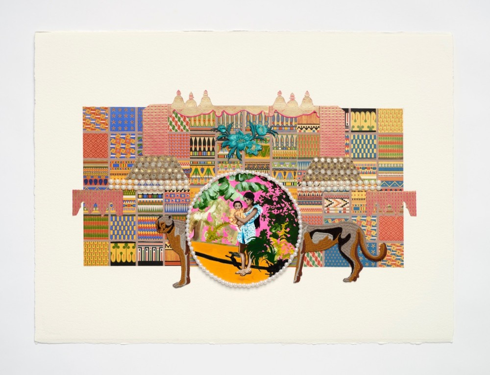 Drawing on her Indo-Caribbean heritage, Mattai’s multidisciplinary practice employs techniques such as embroidery, needlepoint and beading to create vivid and formally complex works that straddle the line between two- and three-dimensionality. In previous bodies of work, Mattai has made use of representational aesthetics from Indian miniature paintings while also referencing the subject and form of European pastoral landscapes and portraiture. Building upon this creative exploration, these works on paper also examine the history of ornamentation by sourcing examples from 19th-century academic volumes that represent the colonial practice of essentializing diverse cultures and traditions through a set of pictorial conventions. The process of collage allows Mattai to remain connected to the specific histories embedded within her materials—including pieces of embroidery, book pages and fragments of sari tapestries—while also attempting to unify them with new and inventive compositions.