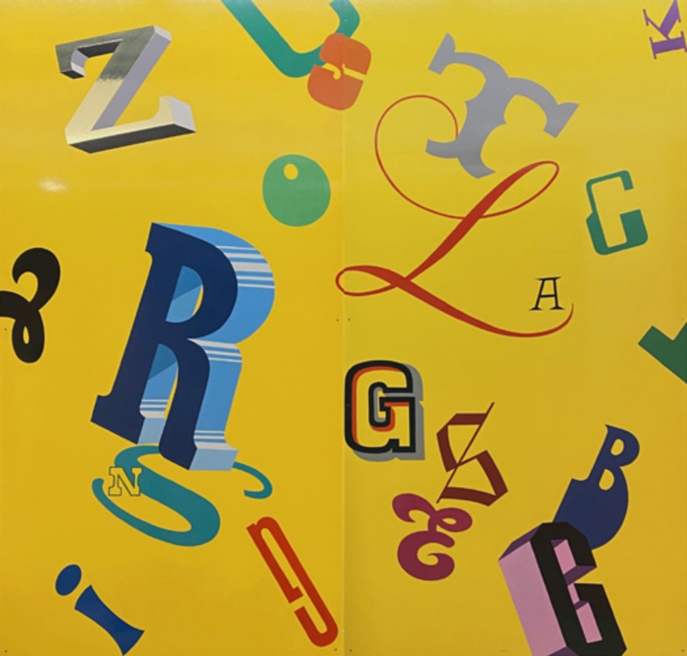Lum’s Language Paintings, from 1987, were inspired by billboards he encountered in Cologne, Germany—advertisements written in an indecipherable script. They evoke the experience of foreignness while experimenting with the globalized visual codes of consumer culture.