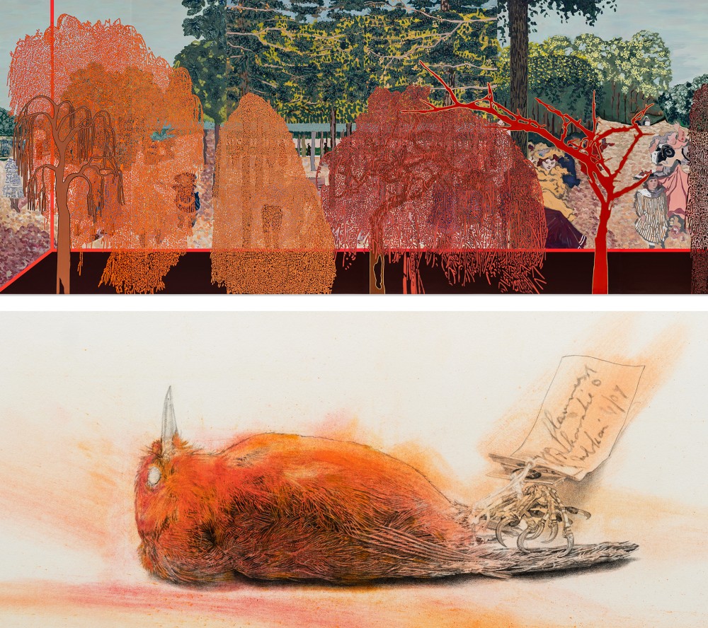 Bowers’s intimate renderings of extinct birds complement Whitney Bedford’s haunting evocations of the natural world. Bedford reinterprets historical landscape paintings by using vibrant hues to contrast a staged frame superimposed with equally dazzling flora and fauna. Bedford’s ambitious new large-scale paintings—comprised of nine separate multi-sized panels—continue her Veduta series. In these nine canvases, she reinterprets Vuillard’s 1894 painting Jardins Publics of people enjoying nature in the setting of a bucolic city park, and for the first time, she introduces figures into the lushly patterned landscape. Bedford obscures Vuillard’s scenes of leisure by placing a screen of orange, red, and green seeping willows, whose unnatural colors evoke a sense of ecological dread, in the foreground of the composition. Plants found in Los Angeles’s public botanical gardens provide the inspiration for Bedford’s trees and shrubs. Her re-interpretation of Vuillard’s work suggests both a mourning for a bygone era of bucolic plentitude and a critical examination of what seems now a romanticized view of the natural world.